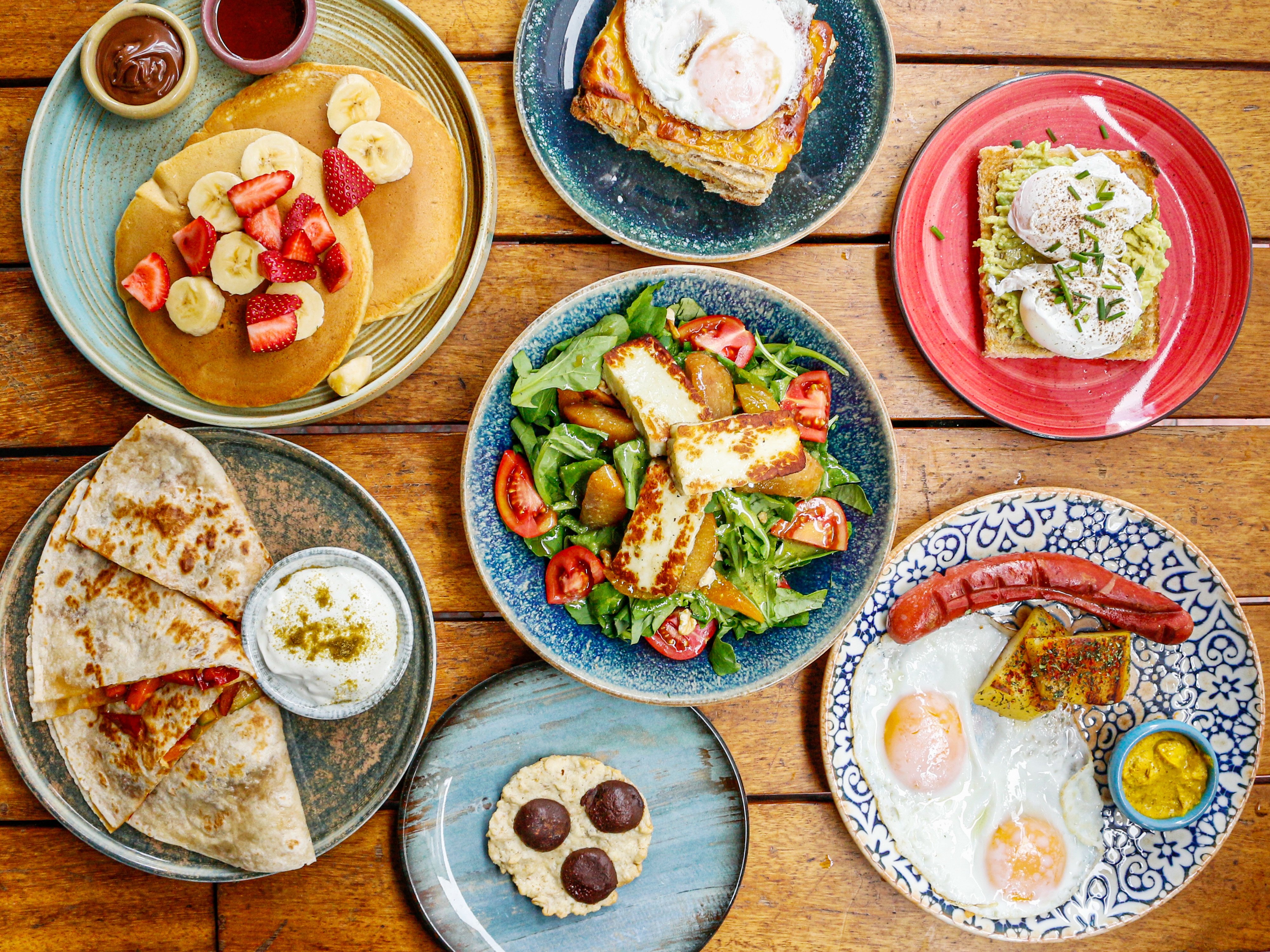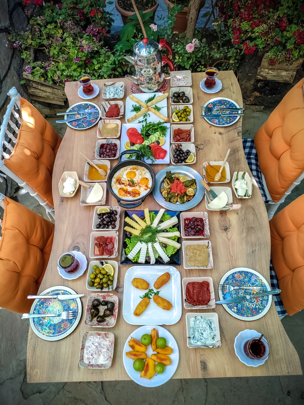 Beyaz peynir, kaşar peyniri, çeçil peyniri, siyah zeytin, yeşil zeytin, çilek reçeli, bal-kaymak, haşlanmış yumurta, acuka, domates, salatalık, yeşillik, patates kızartması...