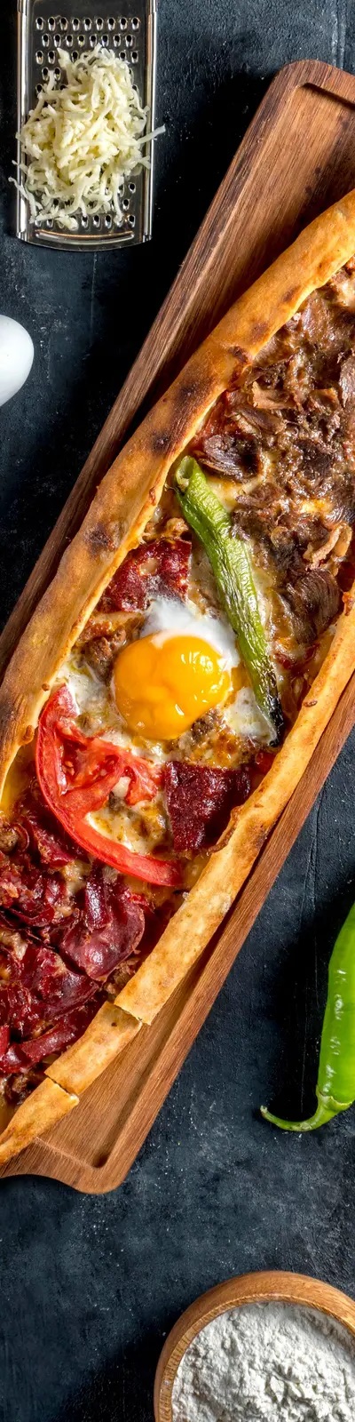 Patates püresi, közlenmiş domates, acı sos ve tırnak pide ile.