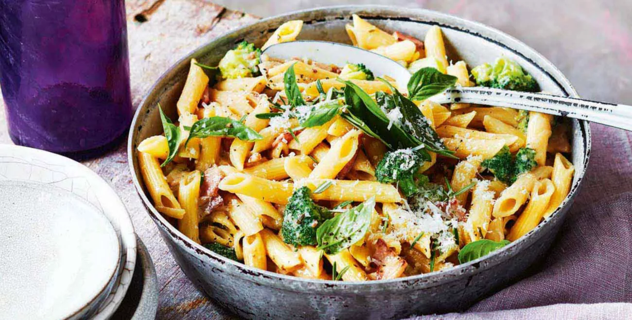 Julyen piliç parçaları, biber, mantar, köri baharatı, salata, krema ve makarna ile servis edilir.