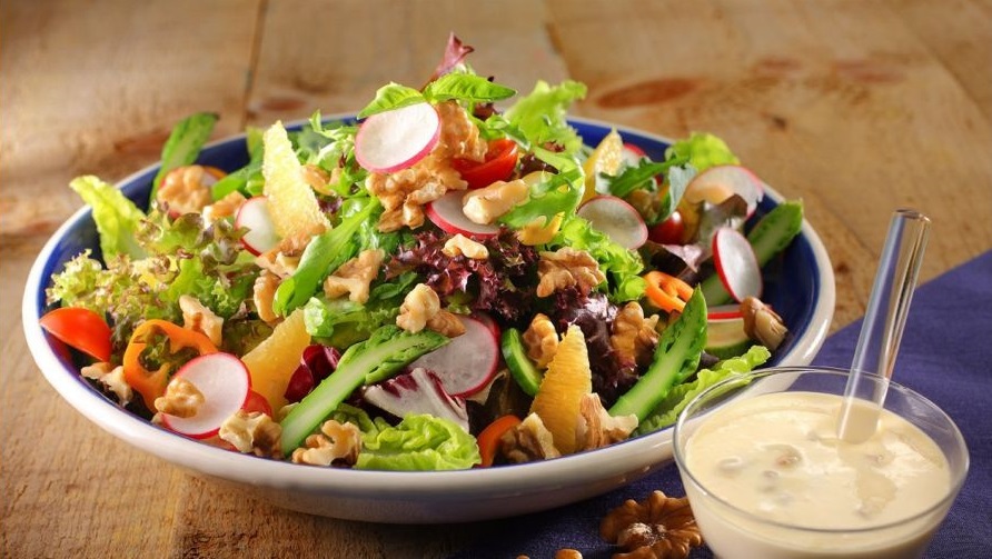 Mevsim yeşillikleri, dilim zeytin, küp beyaz peynir, vinegret sos ile...