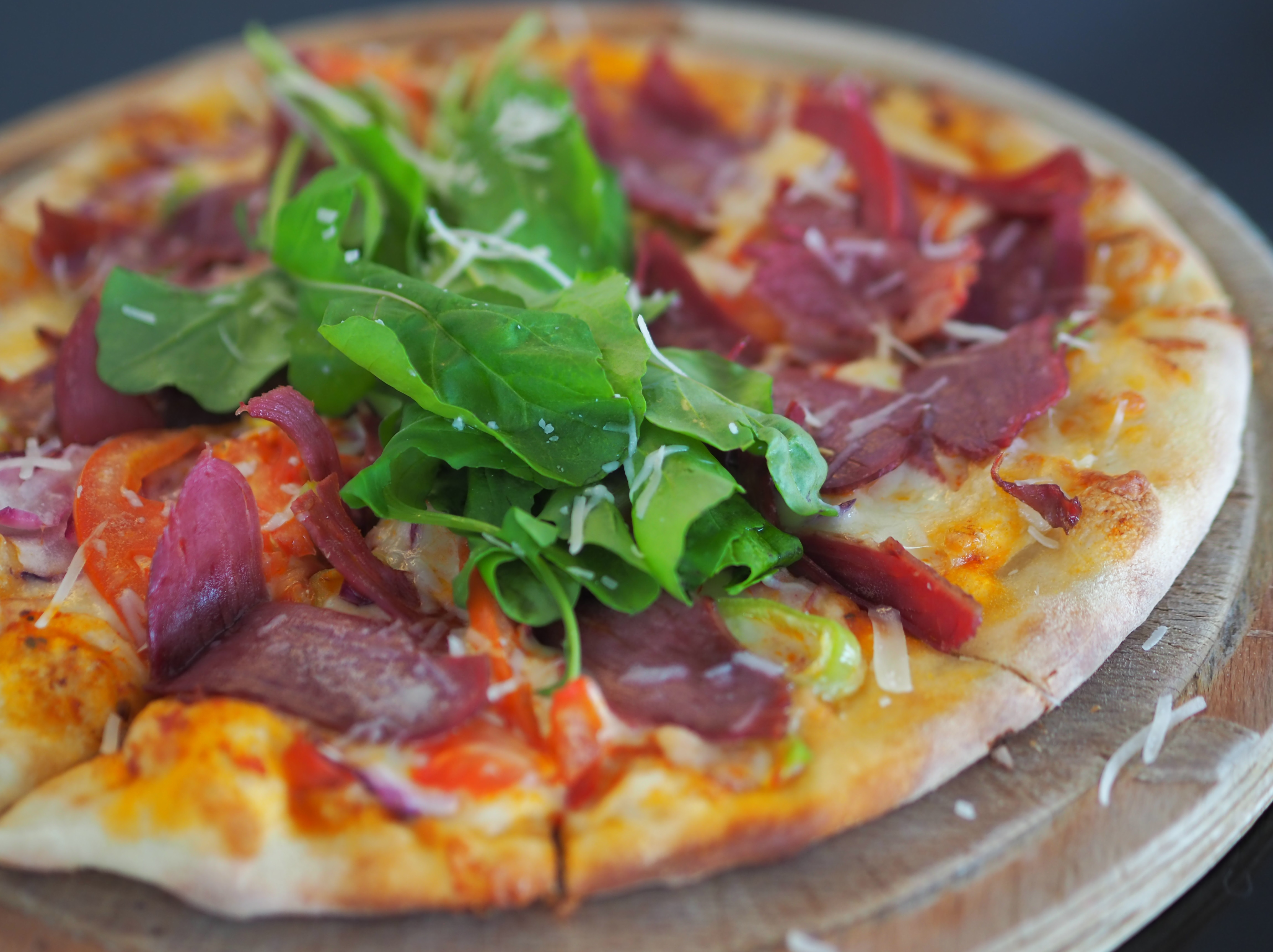 Domates sos, çeri domates, mısır, dilim zeytin, kapya biber, mantar, enginar kalbi, mozarella peyniri ve roka
