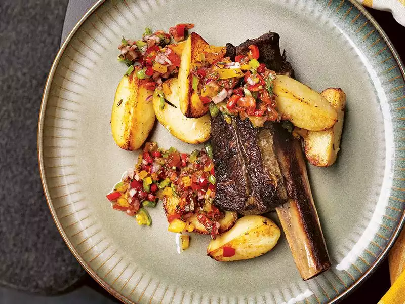 Odun ateşinde kaburga, domates sos, mozarella peyniri, jelapeno biber, çeri domates, çıtır soğan