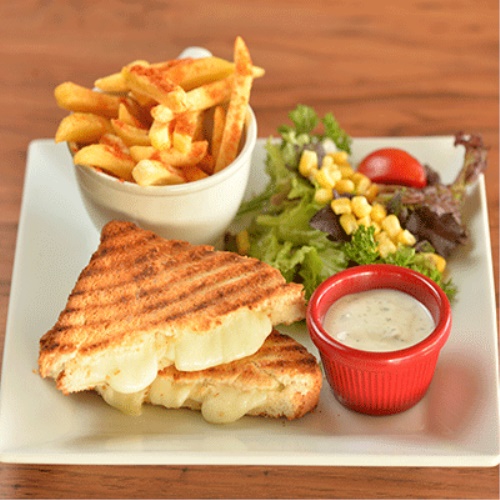 Izgara edilmiş piliç, marul, karamelize soğan, hardal sos, patates kızartması ve özel soslar ile...
