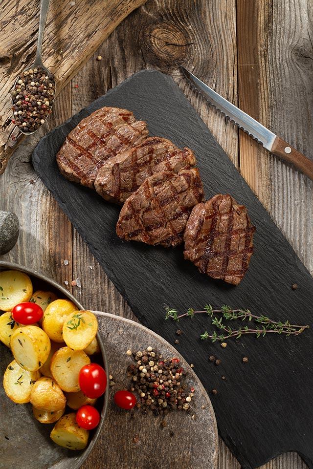 Bonfile dilimleri, hardallı patates püresi, domates, biber ve tereyağ sosu ile servis edilir.